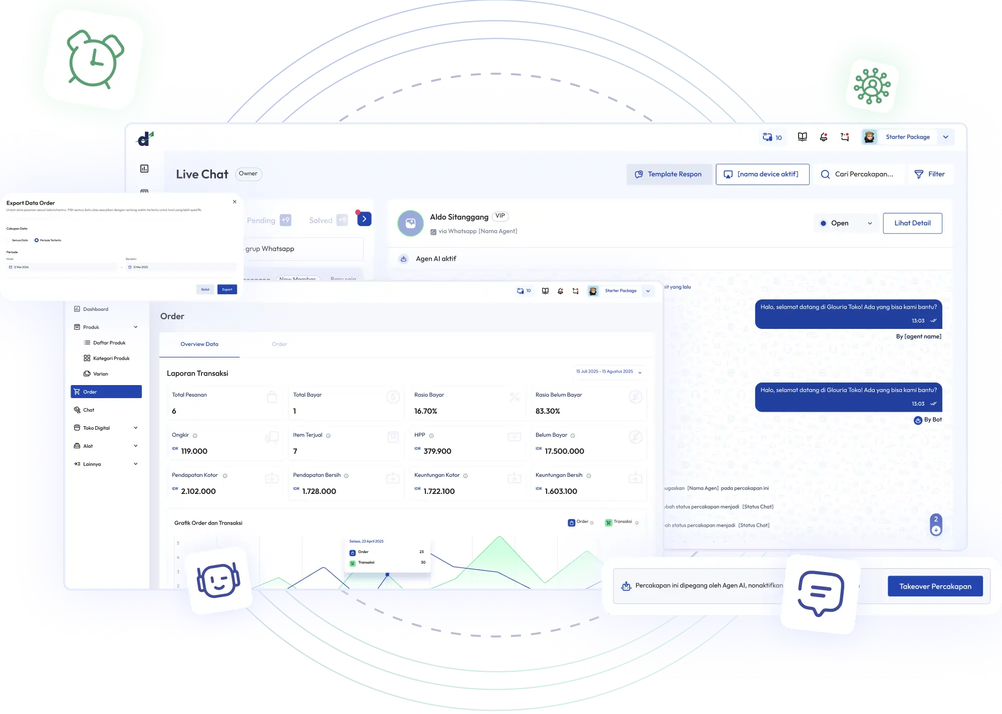 Dazo bantu Anda kelola chat, order, dan laporan secara otomatis lewat Chatbot AI dalam satu platform praktis.